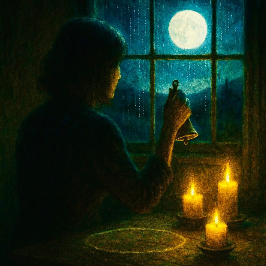 Candles. Chalk. Door open to the moon. The bell in her hand, the card’s thread wrapped round her wrist as if it were a promise.